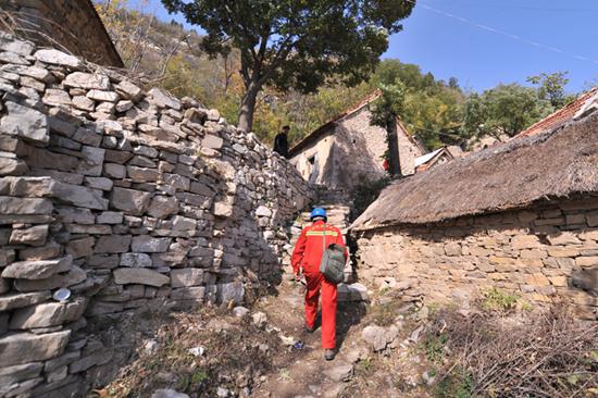 從李單峪村再往里的路,摩托車派不上用場(chǎng),全部要靠步行。于是工具包、鐵鞋、導(dǎo)線、還有給老人們捎帶的物品全部從摩托車上轉(zhuǎn)移到了曹永海肩上。4里路,要走30多分鐘,而曹永海背負(fù)著保供電的責(zé)任,背負(fù)著老人們的期盼,在這條路一走就走了15年。