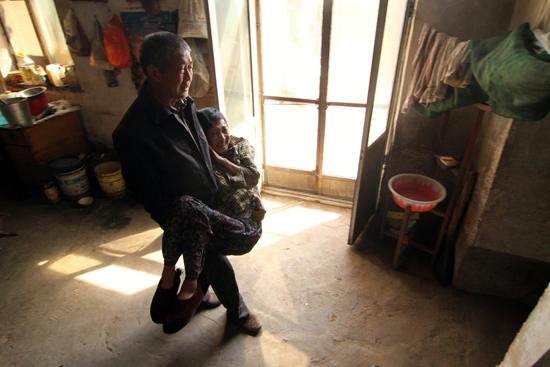 2012年4月初,他的右腳長(zhǎng)了一個(gè)囊腫,嚴(yán)重時(shí)腳腫得老高,根本不敢行走。找了幫手后,他到接山鎮(zhèn)衛(wèi)生院進(jìn)行門診手術(shù)?舍t(yī)生堅(jiān)持要他住院治療,以便于傷口愈合。可家里的妻子誰能照顧得了?就這樣,他手術(shù)后一瘸一拐長(zhǎng)達(dá)3個(gè)月傷口才愈合,但從未間斷過照顧妻子。孩子們心疼他,想替他照顧一下母親,可拗不過他。