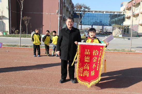兩天后,失主費盡周折打聽到了馬軒是梁山縣第一實驗小學(xué)南校區(qū)的學(xué)生,并向?qū)W校送錦旗一面。在學(xué)校的頒獎會上,馬軒同學(xué)說:不是自己的東西就不能要,如果每一個人都能把撿到的東西物歸原主,世界變得會更加美好。