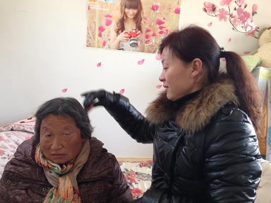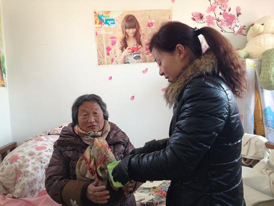 隨著婆婆年齡漸大,頸椎不好,血壓不穩(wěn),有時(shí)都需要人照顧。鮑愛群始終無微不至的照顧著婆婆,2013年,婆婆因摔傷腿住進(jìn)了醫(yī)院,她天天陪護(hù)在身邊,為老人端屎端尿,擦洗身體,喂飯吃藥。出院后她為婆婆洗澡、梳頭、理發(fā)、捶背,剪指甲,無微不至,精心侍侯,從不厭煩。在她的精心照護(hù)下,婆婆病情大有好轉(zhuǎn),回到家中為了不讓臥床的婆婆寂寞,她更換了彩電,戲曲播放機(jī),時(shí)常讓婆婆看看電視,聽聽?wèi)蚯。鮑愛群既要服侍婆婆,又要干干洗店里的活,多年來任勞任怨,毫無怨言。