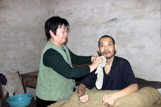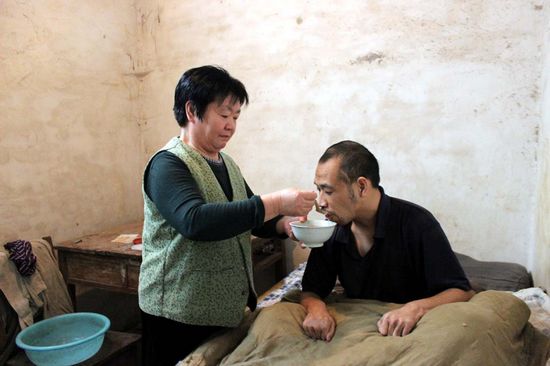 2002年,趙玉蘭退休,可以專心伺候?qū)O源了。然而,幸福在2009年12月13日戛然而止。這天,孫源獨(dú)自過馬路時(shí),被一輛疾馳而來的轎車撞飛30多米,鼻子、嘴里都是血,左腿骨折,腦部中度腦震蕩,時(shí)而清醒時(shí)而糊涂,加之右腿自小無力,只能臥在床上了。自那以后,趙玉蘭再也沒有清閑過,沒睡過一個(gè)安穩(wěn)覺,哪里也去不了。起來一天陪他說話、喂飯喝水、按摩、換尿布,一步也不能離開!翱粗⒆舆@樣,咱受點(diǎn)苦累都不要緊,只要我活一天就照顧孩子一天!”趙玉蘭說。