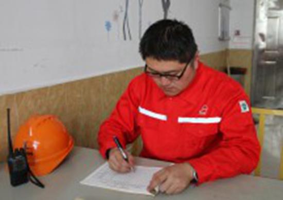 呂利群在采油值班室,認(rèn)真填寫(xiě)《采油日?qǐng)?bào)》記錄本,詳細(xì)記錄當(dāng)天的部分生成參數(shù)。