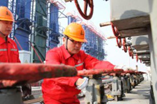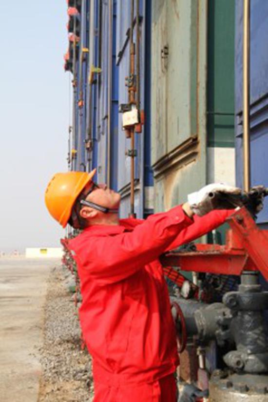 呂利群用活扳手調(diào)整原油自動(dòng)計(jì)量器管線上的閘閥壓蓋,確保沒(méi)有泄漏。