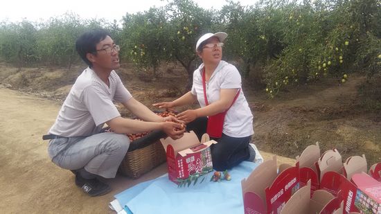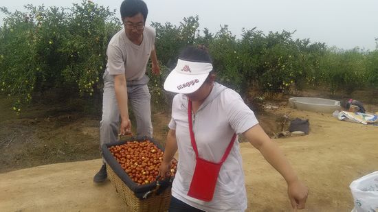 品種培育成功后,夫妻倆立即擴大種植面積。兩人更是將“誠實做人,誠信做事”的理念用在了棗園的經(jīng)營之中,并一如既往地堅持了下去。鄒均亭、谷詠梅都是個有心人,深知誠信經(jīng)營的重要性。為了保證大棗品質(zhì),夫妻二人從一開始就買大廠家、口碑好的肥料,用他倆的話說:“買大廠家的肥料,心里踏實,這樣長出來的棗子才能品質(zhì)好,吃起來放心。”村里有些農(nóng)戶也想進行新品種的種植,兩人便無條件給他們提供技術(shù)支持,幫助他們購置棗樹苗。采購時,夫妻二人總是左挑右選,反復甄別,確保他們購買到優(yōu)質(zhì)樹苗。有時一些棗苗在剛接種時會出現(xiàn)一些問題,兩人都是無條件的幫助農(nóng)戶解決。棗苗如果成活率偏低,倆人還會再從自家的苗木中抽取幾棵給農(nóng)戶。給自家棗樹噴灑農(nóng)藥之前,夫妻倆總是反復研究,先在小范圍進行打藥試驗,在經(jīng)過一段時間,棗樹最低的要藥量確定之后,才在棗園里全部噴灑,最大程度降低農(nóng)藥殘留,確保棗子的食用安全。他們說:“這大棗都是要給咱老百姓自己吃的,咱不能做黑心買賣,農(nóng)藥要盡量少殘留,這樣老百姓吃的時候就能更安全!闭沁@樣的誠信種植,誠信經(jīng)營,倆大學生棗園已經(jīng)成了這十里八鄉(xiāng)的榜樣,用什么化肥,怎么種,這周圍的棗樹種植者都愿意去問問這夫妻倆,大家都說:“這兩口子做人誠信,從來不會騙咱們,聽了他們的建議,咱這棗樹長得是一年比一年好呢!