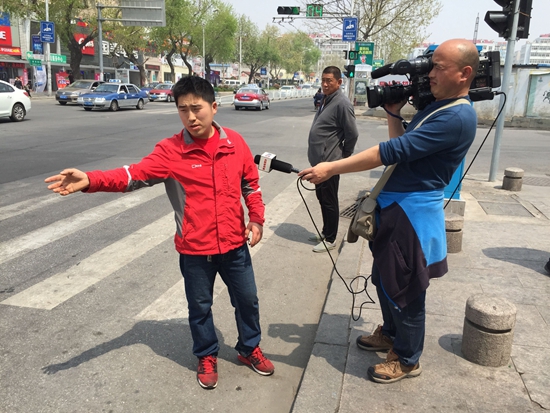 最美路人南山商戶韓慶全(左一)接受青島電視臺(tái)采訪。