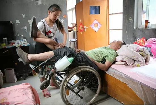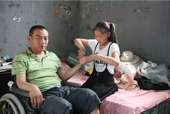 冰冰是第一個接受現(xiàn)實的。她不再抱怨,而是默默地為父親按摩、捶背,幫父親做簡易的康復治療,將體重140斤的父親從輪椅抱到床上……小小年紀的她,幾乎能完成對父親所有的照料!