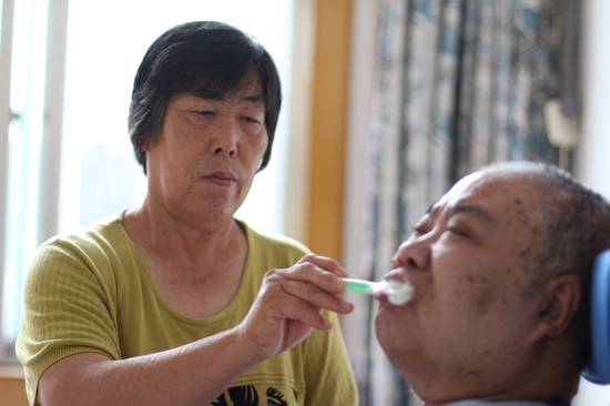 早上起床,先給劉瑞慶穿好衣服,然后把170多斤的劉瑞慶背到輪椅上,幫他洗臉刷牙、刮胡子,一切收拾妥當后,再一口一口地給他喂飯、洗漱……如果上午天氣好就用車子推他出去曬曬太陽散心,散心回家后劉瑞慶要么在輪椅上看電視,要么就讓嫂子把他背到床上休息。午睡后,郭希英再把他背到輪椅上在屋里和院子里來回轉轉。晚上,劉瑞慶需要有人不停地幫他翻身,為此,郭希英把床放在和小叔子同一個房間里,隨時照顧他喝水、大小便,幫他按摩、捶背……由于郭希英細心照顧,這么多年來,劉瑞慶的身上從未長過痱子和褥瘡。到醫(yī)院體檢時,連醫(yī)生都驚詫,這樣一位近四十年臥床的高位癱瘓者,身上沒有一點異味,內(nèi)臟器官完全正常的。長年臥床讓劉瑞慶常常心理失衡,動輒發(fā)脾氣、甩臉子……這時,郭希英難過一陣后就轉為心疼:天天躺在床上不能動,他哪能沒有點火氣?!劉瑞慶大小便沒有知覺,讓嫂子幫著導尿排便,最初他極端難受難堪,甚至難過得直哭,可郭希英說,“你就是我兄弟,我不幫你誰幫?!你自己又不能!”劉瑞慶正常排便一次得一至兩個小時,一旦便秘就得三四個小時,最長的時5個多小時,每次便秘,郭希英就用手指一點點摳。在照顧的過程中,郭希英最擔心的是劉瑞慶感冒,每次感冒,劉瑞慶就會有痰,他自己使不上勁往外咳,很容易堵住氣管窒息,這時候,郭希英就寸步不離地守著,一看他有痰就跪在面前,幫助他按摩推拿腹部,借助著外力讓劉瑞慶努力使勁把痰咳出來。