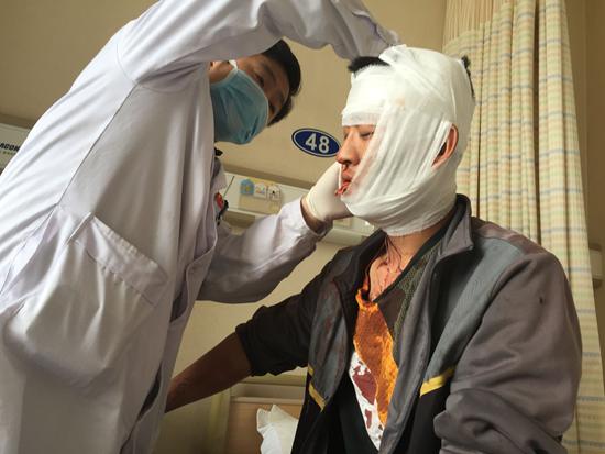 師麗偉(右)見義勇為受傷后,縫合手術(shù)后,師麗偉頭上和臉上纏著一層層紗布,圖為海慈醫(yī)院醫(yī)生為其細(xì)心包扎