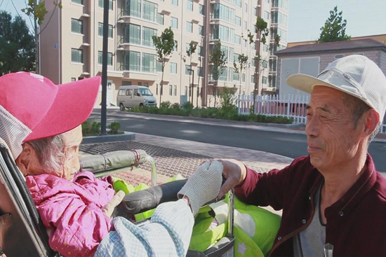 王金忠腿有殘疾,卻每天一瘸一拐地推著102歲的老母親遛彎,走一段時間就停下來歇歇,跪在地上給老人整整鞋子、揪揪衣服,摸摸老人的頭,讓母親安靜下來。這樣的“遛彎”路,王金忠已經(jīng)推著母親走了20余年了!