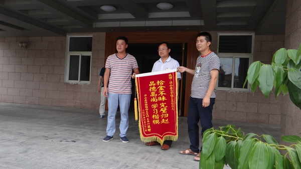 2016年6月21日下午16時,一輛白色現(xiàn)代轎車駛?cè)肓荷娇h馬營鎮(zhèn)政府院內(nèi),從車內(nèi)下來兩個中年男人,手中拿著一面錦旗,上面寫著:“拾金不昧完璧歸趙,品德高尚學(xué)習(xí)楷模”。