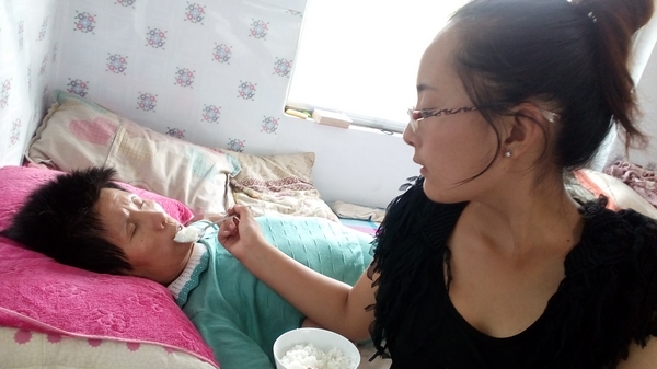 出院后,為了減輕爸爸負(fù)擔(dān)她就在學(xué)校和家之間奔波。學(xué)校有重要考試活動(dòng),就回學(xué)校,其他時(shí)間就在家一邊自學(xué)一邊照顧媽媽,每天都要早早起床,做飯給爸爸吃,給媽媽擦洗,翻身,按摩,喂飯。還要抽空做家務(wù)。媽媽大小便不能自理,有時(shí)候大便排不出來,就用手一點(diǎn)一點(diǎn)摳出來,從來沒有抱怨過。每天晚上都要忙到好晚,半夜還要起來給媽媽翻身,喝水增減被褥。有時(shí)候白天還要幫爸爸去地里種地,鋤草,施肥,收莊稼…里里外外都打理的很好,為爸爸減輕了很多負(fù)擔(dān)。