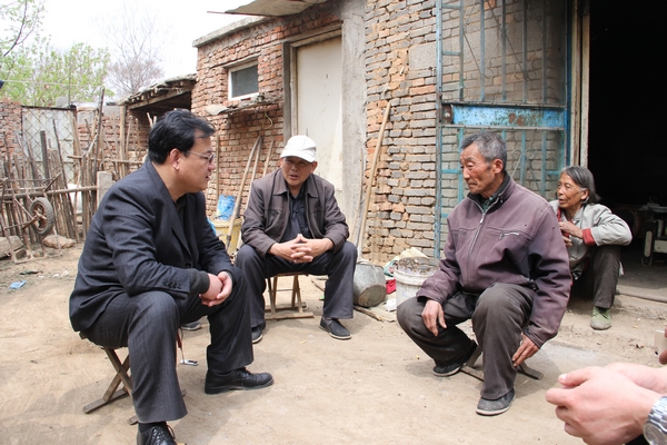2016年4月7日,徐文峰到肥城尋訪張海亭烈士的后人,圖為徐文峰與烈士侄子張安貴交談