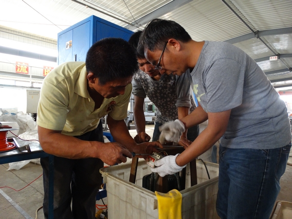 成為總經(jīng)理的齊孟(右一)現(xiàn)在還在經(jīng)常和員工一起解決機器故障