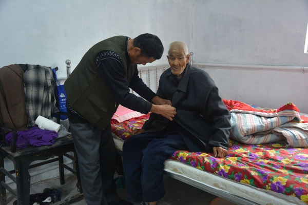 天剛剛亮,年過(guò)六旬的侄子、侄媳婦早早起床,侄媳婦做好熱騰騰的早飯后,侄子剛好伺候89歲的叔叔起床。吃完早飯后,侄子、侄媳婦扶著叔叔到院子里曬曬太陽(yáng)……這樣溫馨的故事,每天都在蔣元岱這個(gè)普通的家庭上演。