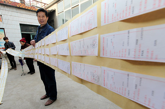 自1995年起他堅持每月從做農(nóng)電工的工資中拿出100元錢資助貧困家庭。如今,為了方便保存,他把20年來保留的匯款收據(jù)有序排列粘貼在一起,形成了12米長的特殊“匯款單”。