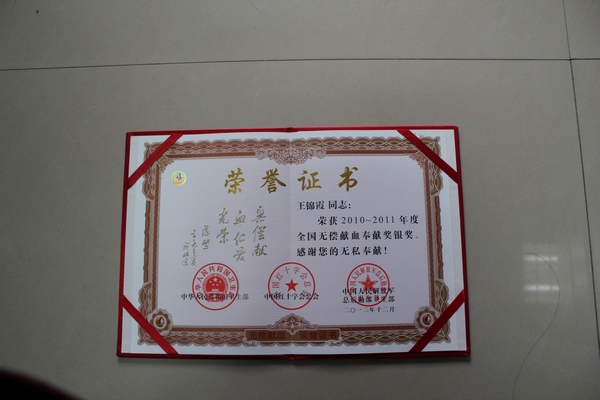 2012年榮獲“全國無償獻(xiàn)血奉獻(xiàn)獎銀獎”。