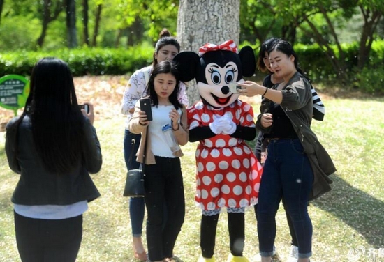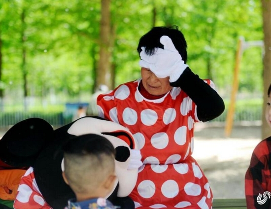 為了讓兒媳得到更好的治療,銀丕芝決定干些力所能及的活掙錢,幫人刷盤子、掃地這樣的活她都干過。后來她從一位病友的演出公司借來米老鼠樣式的道具服,上街與人合影。濟(jì)南森林公園、大明湖畔等處,都留下了她略微佝僂的身影?颗c人合影,銀丕芝一天可以掙二三十元錢,除了飯錢,剩下的她都用來給兒媳買營養(yǎng)品。