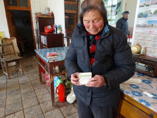 “以前他都是把記有紅十字會(huì)的電話的紙條放在這里面,天天帶著!贝揎L(fēng)花拿出一個(gè)用牛奶袋做的小袋子,王文安生前就一直帶著這個(gè)袋子,尤其是住院的時(shí)候。