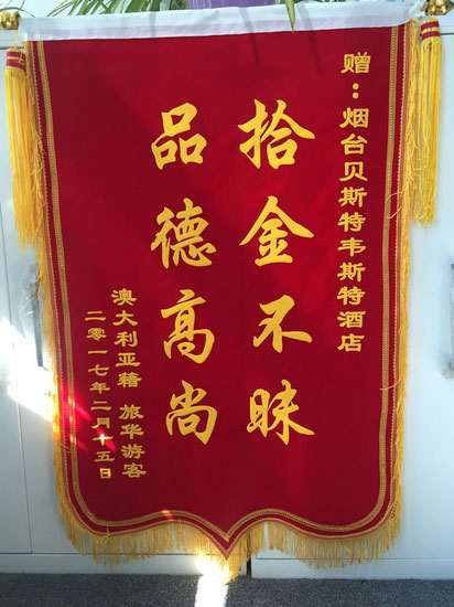 據(jù)了解,失主發(fā)現(xiàn)自己錢包不見后,一直以為錢包落在了媽媽家中,因此沒有主動聯(lián)系酒店。當(dāng)她接到酒店的電話時(shí)驚喜萬分,拿到錢包后,一珠女士堅(jiān)持要拿出酬金答謝姜文紅和酒店,被姜文紅婉言拒絕了。無奈之下,一珠女士委托煙臺的朋友制作了“拾金不昧 品德高尚”錦旗表達(dá)謝意。在姜文紅本人看來一個(gè)最平常不多的舉動,卻真正見證了一個(gè)不染塵埃的靈魂。也見證了他一顆金子般的心,詮釋著誠信的真諦。