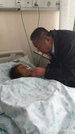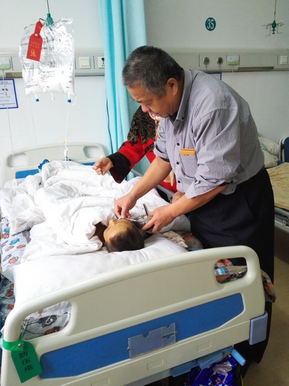 時(shí)間一天天過去,妻子因重度營養(yǎng)不良身體變得非常衰弱,但在他無微不至的照顧下,妻子的生命在堅(jiān)強(qiáng)的延續(xù)著。2015年6月,經(jīng)推薦他又帶著妻子到北京市門頭溝區(qū)醫(yī)院救治,經(jīng)過3個(gè)多月的搶救支持治療,情況雖有改善,但肚子上的腸液一直漏,每天有2000多毫升,反復(fù)膿腫流膿。因保守治療沒法愈合,最終于9月28日再次做了探查、小腸與結(jié)腸吻合手術(shù)。這期間,醫(yī)院多次下達(dá)病危通知書,但他始終不離不棄。他一邊悉心照顧,用真情的語言一遍遍呼喚著昏迷的妻子,一邊繼續(xù)借遍親朋好友尋求援助,籌借治療費(fèi)用。同時(shí),因?yàn)楣┭o張,他每隔幾天就去血庫獻(xiàn)血來保障妻子的輸血治療。在他不離不棄的溫情呼喚和精心照顧下,妻子慢慢的醒了過來,但因?yàn)榻璞橛H戚朋友實(shí)在也接濟(jì)不上治療費(fèi),他就帶著妻子回到了當(dāng)?shù)蒯t(yī)院,每天靠著輸營養(yǎng)液維持著生命,但他從來沒想到過放棄。妻子因不能喝水導(dǎo)致嘴唇干裂,他就用棉棒蘸著水給妻子濕潤嘴唇;妻子出現(xiàn)了失憶癥狀,經(jīng)常說胡話,他就把妻子當(dāng)作小孩兒一樣逗她開心,并拿著原來的照片一遍遍給妻子看幫助回憶;妻子大小便失禁,他就給妻子端屎端尿,換衣洗褥,每天給妻子擦拭身體……他用自己真摯的愛、純潔的情和無怨無悔的悉心照料,多次把妻子從死神手里拽了回來,妻子的主治醫(yī)生在個(gè)人微博上說他“用‘愛’創(chuàng)造了生命的奇跡!”