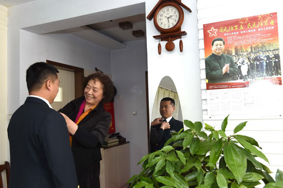 王書香阿姨為劉晉鋒整理軍裝-逄忠平攝