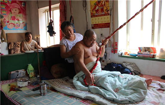 走進趙秀云家,屋里的陳設非常簡陋,連件像樣的家具都沒有,最引人注意的就是屋里的兩鋪大炕,一鋪炕上躺著她兒子,一鋪炕上躺著她老伴,倆人雖然都不能自理,但卻穿戴得干凈利索,而這都離不開趙秀云的付出。