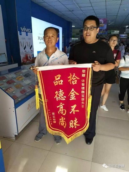 而此時,焦急的失主也發(fā)動了各種關(guān)系在微信上轉(zhuǎn)發(fā)尋物啟事,剛好魏寶國在一個戰(zhàn)友群里看到了戰(zhàn)友轉(zhuǎn)發(fā)的尋物啟事。魏寶國立即聯(lián)系上失主,送還了手包和現(xiàn)金。能把這么多現(xiàn)金找回來,失主很激動,當(dāng)即拿出現(xiàn)金表示感謝,卻被魏寶國婉言謝絕。2017年8月3日下午,失主為魏寶國送來了繡有“拾金不昧 品德高尚”的錦旗,以表達(dá)自己的感激之情。