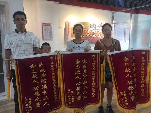2017年8月23日,賈江濤和同事到黃河邊游玩時突然聽到不遠處有人大喊救命。賈江濤趕緊跑下觀景臺,朝岸邊飛跑,看到三名落水者隨著河水起伏,脫下衣服就跳了下去。他先把離他近的兩個小男孩救上岸,又趕緊跳入水中去救第三個人。“救第三個人時,難度大了些!辟Z江濤回憶說。第三位被救的是一位青年女子,比孩子重很多,且因為在水里待得時間久了,意識也已經(jīng)開始模糊。加上離岸邊越遠,水流越急,連救兩人的賈江濤已經(jīng)感覺喘不過氣來,但他毫不畏懼,在水中夠到落水女子的手后,便死命抓住,使出全力拼命劃水,終于將第三個人也救到了岸邊。