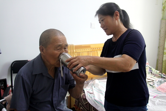 給老人喂水,她總是耐心細(xì)致