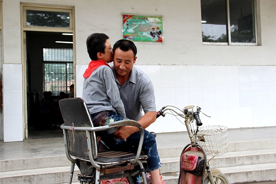 孩子上學(xué)后,師學(xué)武更忙了。每天早晨6點(diǎn),他首先是把12歲的兒子扶起來,幫助穿上衣服,從床上抱到院里的廁所進(jìn)行方便,然后把他放到輪椅上,幫助兒子打水洗漱。一切停當(dāng)后,已是6點(diǎn)半了,這時(shí),老伴已經(jīng)做好了早飯,師學(xué)武把盛好的飯菜端到兒子嘴邊一口一口的喂飯,待兒子吃完后,他隨便的巴拉一點(diǎn)早飯,把兒子從輪椅上抱到電動(dòng)車后座上,為了是兒子坐的舒服安全,他專門給兒子定做了一個(gè)大型的寶寶椅,防止兒子在路上掉下車來。7點(diǎn)半左右,他們一同趕到了一公里之外的稅郭鎮(zhèn)王堂小學(xué)。到校后,師學(xué)武把兒子從車座上抱到位于教學(xué)樓一樓的二年級(jí)教師內(nèi),安排好兒子后,早晨的第一節(jié)課馬上就要開始了。伴隨著朗朗的讀書聲,坐在兒子旁邊的師學(xué)武緩緩的舒了一口氣,看著兒子聚精會(huì)神的聽課、寫作業(yè),這位已近天命的漢子感覺到很愜意,很滿足,這也許是他一天當(dāng)中最幸福的時(shí)刻了。