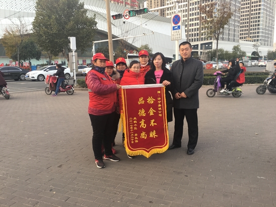2017年11月20日早上七點(diǎn)半左右,孫紅太在太白路萬達(dá)崗路口進(jìn)行文明勸導(dǎo)執(zhí)勤。那天的天氣非常寒冷,風(fēng)也很大,孫紅太頂著刺骨的寒風(fēng)堅(jiān)守崗位認(rèn)真進(jìn)行交通勸導(dǎo)。由于當(dāng)時(shí)處于上班上學(xué)的高峰時(shí)期,人流量很大,孫紅太密切關(guān)注路上情況,不容許自己有一絲懈怠馬虎。綠燈亮了,當(dāng)孫紅太下意識(shí)后退幾步給行人讓道的時(shí)候,突然感到腳下被什么東西給絆了一下,低頭一看,原來是一個(gè)棕色的手提袋。打開手提袋一看,整個(gè)包塞得滿滿的,內(nèi)有手機(jī)一部,五千余元現(xiàn)金和多張銀行卡、醫(yī)保卡、身份證等重要物品。孫紅太當(dāng)時(shí)就想,丟了這么多貴重的東西,失主得多著急!得趕緊找到失主才行。但當(dāng)時(shí)是早上上班高峰期,人流量比較大,就地尋找失主真是大海撈針。想著失主焦慮的心情,孫紅太志馬上聯(lián)系到班長與公司趕緊溝通,通過各種渠道想辦法聯(lián)系失主。經(jīng)過多方積極尋找聯(lián)系,在孫紅太下班時(shí),終于通過撿到的手機(jī)聯(lián)系上了失主。滿頭大汗趕到的失主見到孫紅太時(shí)就一直不停地道謝,“真的非常感謝,您這種精神太可貴了。我的手提包里有十幾張卡,加起來有50多萬元,要是找不到,我就遇到大麻煩了啊,就算每張都去掛失重辦,至少得折騰一兩個(gè)星期,里面的錢也不知道什么時(shí)候才能取出來,您真是幫了我的大忙啊!笔е鳟(dāng)即掏出一千元現(xiàn)金給孫紅太表示感謝,被孫紅太婉言謝絕,她說“不用謝,我只是做了應(yīng)該做的,誰丟東西都會(huì)很著急,別人的東西我們不能要!彪S后,失主為感謝孫紅太拾金不昧的高尚品德,特制作了一面錦旗,于11月22日下午送到了志愿者服務(wù)崗上。提起孫紅太拾金不昧的行為,失主直到現(xiàn)在還贊不絕口。
