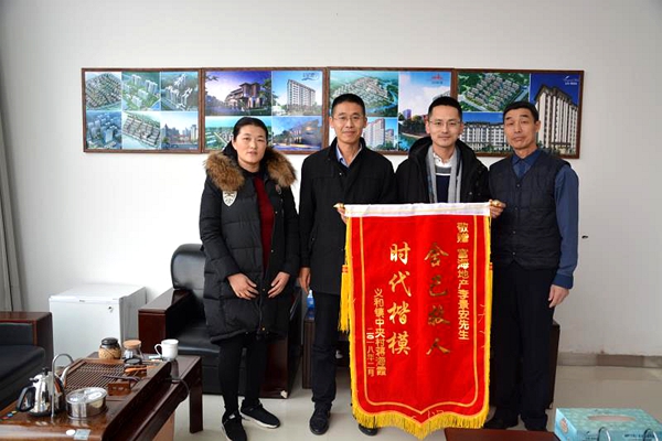 2018年2月8日,一位老人和一位婦女帶著一面書(shū)寫(xiě)著“舍己為人,時(shí)代楷!卑藗(gè)燙金大字的錦旗來(lái)到富海地產(chǎn)辦公室,感謝李景安同志的救命之恩。原來(lái),2017年12月30日中午12時(shí)30分許,河口區(qū)義和鎮(zhèn)中夾村的蔣海霞載著下課的兒子騰騰往家走,沿河民路由東向西行駛時(shí)開(kāi)車(chē)走神,汽車(chē)失去控制翻入路邊河里,四輪朝上。
