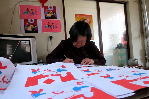 去年八月,王均花加入到嵐山區(qū)婦聯(lián)組織的農(nóng)民畫制作活動中!巴砩祥e著,時間也浪費了,畫農(nóng)民畫怎么也能添補添補。底版是他們的,我們涂上顏色,一張幾塊錢的加工費!蓖蹙ㄕf,“我笨得不行,經(jīng)過好幾次培訓(xùn),第一次交了150張,沒一張合格的。問老師,老師說我上色不均勻!