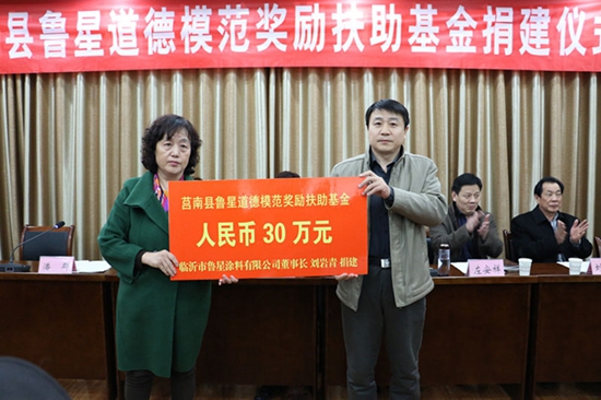出資設(shè)立莒南縣魯星道德模范獎(jiǎng)勵(lì)扶助基金(左)