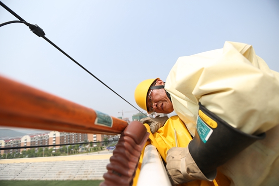 灼熱的陽光下,不一會(huì)兒,劉樸明臉上的汗水便已成股,順著脖子流進(jìn)了密不透風(fēng)的絕緣衣里。作業(yè)間隙,劉樸明會(huì)稍稍解一解絕緣衣的第一?圩,只是幾十秒的短暫休息之后,他又馬上整理好絕緣衣,戴上絕緣手套投入工作。帶電作業(yè)有相當(dāng)大的危險(xiǎn)性,容不得一點(diǎn)馬虎。細(xì)、精、嚴(yán)的工作作風(fēng)從他的師父一直傳承到他這里。