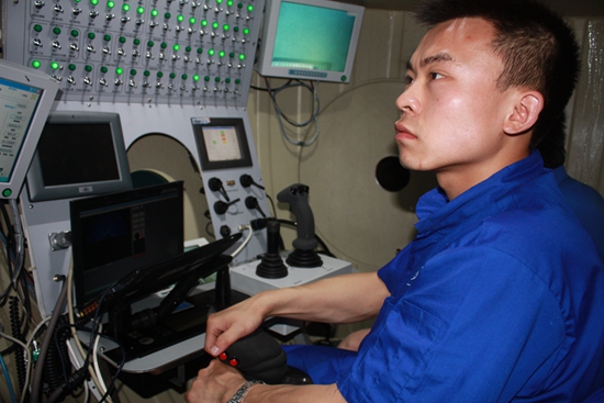 唐嘉陵在艙內(nèi)操控潛水器