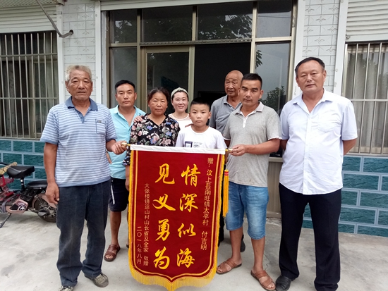 “大爺,可算是找到您了,您是我孩子的救命恩人,我們一家人在這里給您跪下了……”8月28日上午,家住汶上縣南旺鎮(zhèn)太平村的付吉明老人家門口圍滿了人,來自嘉祥縣大張樓鎮(zhèn)運山村的山長省一家?guī)状斡o老人跪下謝恩,都被老人趕緊拉了起來。一番交談之后,鄉(xiāng)親們禁不住一個個對老人的義舉豎起了大拇指。