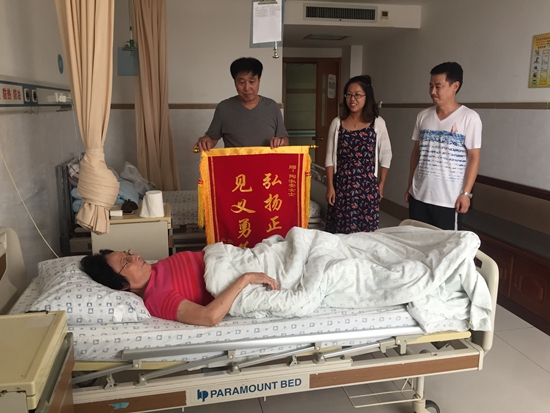 祖孫三人獲救了,但陶淑安的雙腿受傷,無法動彈,就在這時,她還不忘安撫受驚大哭的龍鳳胎孩子,讓張女士快帶孩子離開,不要嚇壞孩子。隨后,陶淑安被救護(hù)車送往醫(yī)院。經(jīng)過檢查,陶淑安右腿韌帶斷裂,立即進(jìn)行了手術(shù)。被救孩子的父母為陶淑安老人送錦旗表示感謝,躺在病床上的陶淑安話語不多,臉上流露著和藹的笑容,很難讓人將眼前這名60歲的老人與見義勇為想到一起。但就是這樣一位整日操持家務(wù)的普通老人,卻在危急時刻伸出援手,讓人敬佩。
