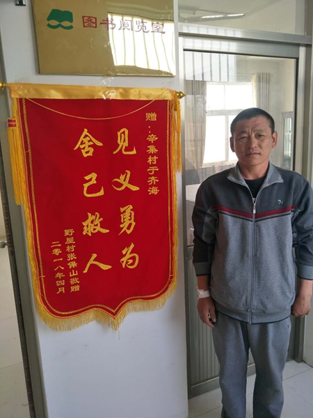 據(jù)了解,被救司機(jī)名叫張保山,是辛集鎮(zhèn)野屋村村民;貞浧甬(dāng)時落水的驚險瞬間,他依然心有余悸,“當(dāng)時車有點(diǎn)晃,我趕緊打方向盤,沒想到一頭就扎到河里了,墜河后車子很快就進(jìn)水了,沒多久駕駛室里的水位就到了車頂附近,我使勁搖車玻璃,但是搖不動,身邊也沒有硬物來砸玻璃!睆埍I礁嬖V記者,當(dāng)時他第一次感覺距離死亡那么近,“我這條命就是海哥給的,我一輩子都不會忘記他的救命之恩!”事后,張保山還特意制作了一面錦旗送到了于其海家中以表謝意。
