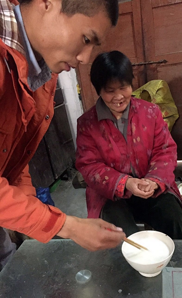 春去冬來、寒來暑往,于書紀始終堅定地照顧患有智力殘疾的母親生活。冬天怕母親凍著,他特意從集市上買回取暖袋放在她胸口,一有空,他就把母親領到戶外,讓她好好享受一下陽光;夏天,他又特意在她床頭安裝了一臺小電扇,多年來,為讓母親和父親生活得好些,他從未添置過一件衣服,身上的衣服都是別人送的大半新衣服。為支撐這個貧寒的家庭,悉心照料好心愛的母親,于書紀放棄了原先在南方一家電子廠打工的豐厚待遇,雞蛋除每天給母親補補身上外,他從沒有舍得吃。書紀經(jīng)常做白菜炒肉,特意將白菜切得很碎。母親的牙齒不好,每次做飯的時候都很注意。做飯、洗衣服、梳頭,將母親生活的小細節(jié)照顧得非常周到。