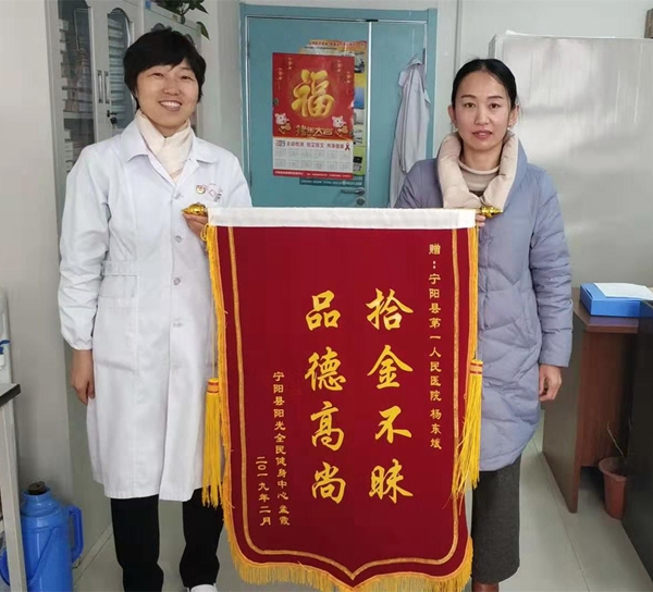 孟女士將錦旗送到寧陽縣第一人民醫(yī)院,由楊東斌同事代領(lǐng)