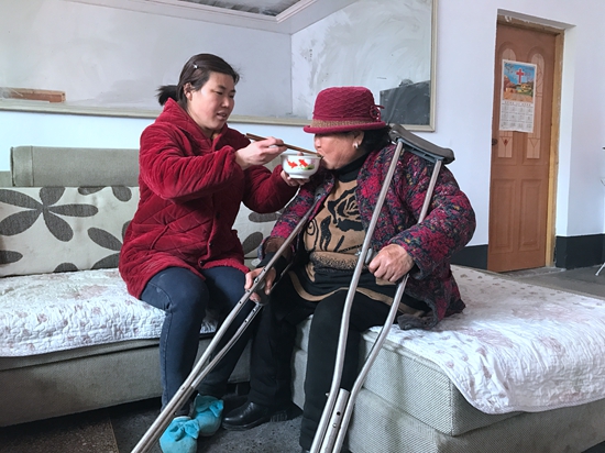 2009年,叔公干活時(shí)被砸傷了腿,叔公是五保,無兒無女,照顧他的擔(dān)子又落到了王艷榮的身上,當(dāng)時(shí)孩子才一歲多,忙不過來,她就騰出一間房讓叔公搬過來住,每天精心照料,直到老人康復(fù)。