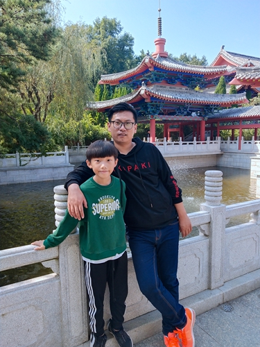 2018年10月1日,紀曉鳴與兒子在威海旅游。