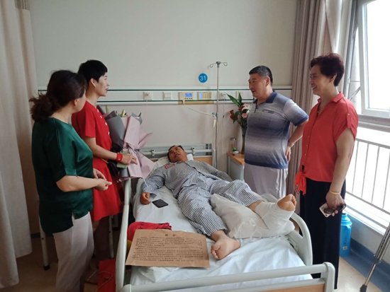 2019年6 月 13 日上午,牛慶德帶領(lǐng)秩序維護(hù)隊(duì)像往常一樣在進(jìn)行日常園區(qū)安全巡邏,經(jīng)過(guò)湖邊時(shí)突然發(fā)現(xiàn)有一女子落水,不斷在掙扎呼救,頭部在水面上時(shí)隱時(shí)現(xiàn),兩手苦苦亂抓。此時(shí)的牛慶德只有一個(gè)念頭:救人要緊!危難之急,牛慶德不顧自身安危,立刻翻下欄桿縱身跳入湖中展開營(yíng)救,由于是夏季,湖中水草雜生,營(yíng)救困難較大,他摸到女子的腳腕,慢慢拉著她朝岸邊拖去,此時(shí)同事固定好救生繩索,將船迅速滑行到落水者附近,將救生圈扔入湖中,牛慶德奮力將女子拖救到岸上。由于組織及時(shí)、行動(dòng)迅速,憑著勇氣和游泳救生技能,在參與者的共同努力下,從落水到救起,整個(gè)救援過(guò)程僅用時(shí)三分鐘,挽救了一個(gè)人的生命。隨后趕到的" 120 "急救醫(yī)生對(duì)落水女子進(jìn)行了身體檢查并及時(shí)送往醫(yī)院,因救援及時(shí),該女子并無(wú)大礙。但牛慶德卻因?yàn)榫热藢?dǎo)致腳部骨折,手部多處劃傷,身體多處挫傷,被送往醫(yī)院救治。