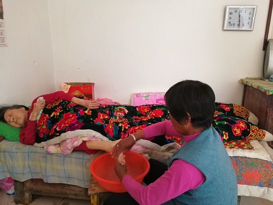 由于多年勞累,朱秀蓮顯得又黑又瘦,與之相比,病榻上的老人雖已96歲高齡,卻面色紅潤(rùn),非常健談!皟合眿D比閨女還親那,閨女離得遠(yuǎn),兒媳婦黑天白夜的都在跟前,要不是秀蓮,我老太太哪能活這么大年紀(jì)!闭f(shuō)到兒媳,老人禁不住滿懷感激地打開(kāi)話匣子,一點(diǎn)也不糊涂!拔覂合眿D就是好,里里外外都是她操心。進(jìn)門幾十年了,她沒(méi)和我置過(guò)一次氣,紅過(guò)一次臉。這么多年,做飯也都是按照我的口味煮,忙著地里還得顧著我,我這一不能動(dòng),一天三頓飯還一口一口的喂我吃,我死嘍也忘不了俺兒媳婦的好……”看著兒媳一天天的操勞,婆婆既心疼又感動(dòng)。