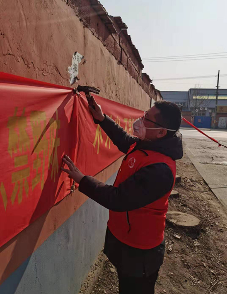 疫情知識(shí)宣傳、群眾安撫勸導(dǎo)是防控的基礎(chǔ)工作,但是迓莊村里許多老人不會(huì)用智能手機(jī)、不了解疫情的發(fā)展情況,趙劍就和村干部一邊入戶核查人員往來(lái)情況,一邊宣傳防護(hù)措施和告知最新疫情,叮囑村民要注意衛(wèi)生、不要串門。為此,趙劍走遍了村子里的大街小胡同,只為將疫情防控知識(shí)傳達(dá)給每一位村民。與此同時(shí),趙劍還充分運(yùn)用村內(nèi)喇叭、全村微信群廣泛宣傳疫情防控倡議書、疫情通告、病毒防控指南等材料,在村內(nèi)顯著位置懸掛起一道道橫幅、張貼倡議書。村民看到第一書記沖鋒在前,恐慌緊張的心情也就平復(fù)下來(lái)。趙劍和迓莊村“兩委”第一時(shí)間成立了疫情防控工作小組,組建了迓莊村抗擊疫情志愿服務(wù)隊(duì)。在村內(nèi)各個(gè)路口設(shè)立了疫情防控檢查站,他和村干部帶頭值守在檢查站,對(duì)進(jìn)出村人員和車輛進(jìn)行嚴(yán)格管控和登記,入村人員逐個(gè)測(cè)體溫,車輛逐個(gè)進(jìn)行消毒處理。為了盡最大所能防止疫情,趙劍和志愿者用84消毒液及時(shí)對(duì)村內(nèi)小賣鋪、衛(wèi)生室、廣場(chǎng)健身設(shè)施等進(jìn)行徹底的消毒工作,確保掐斷病毒進(jìn)入村莊的源頭,為迓莊村構(gòu)筑起了群防群治的嚴(yán)密防線。