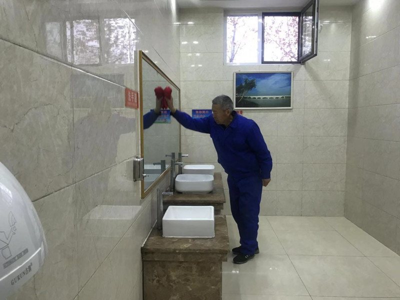 2018年10月,于冰春成為一名普通的公廁保潔員,工作表現(xiàn)優(yōu)異的他被分配到了人流量較大、地處高青縣千乘湖公園的34號公廁。每天早上5點半,于冰春就開始了一天的工作,清掃地面、擦拭潔具、檢查設施……上午9點以后,來公園游玩的市民逐漸增多,整個白天大部分時間里都處于高峰時段。于冰春雖只是一個保潔員,但工作毫不馬虎拖沓,嚴格按照“跟蹤式服務、一客一保潔”衛(wèi)生標準,盡可能地保持潔凈,這樣的節(jié)奏會持續(xù)一整天。“公廁是全天24小時對外開放的,使用這個公廁的人很多,最忙的時段,就沒有一點休息的時間了,要時時刻刻進行保潔。”于冰春說道。到了夜間十點半左右,如廁市民少了很多,一天的工作行將結束,這時的于冰春從里到外將公廁徹底收拾一遍后,才會回到管理間,卸下滿身的疲憊,安安穩(wěn)穩(wěn)地睡上一覺。雖然工作忙碌,一日三餐不能按時吃,但是于冰春對這份工作的熱情從未減少過,他已經(jīng)把這里當成了自己的家。