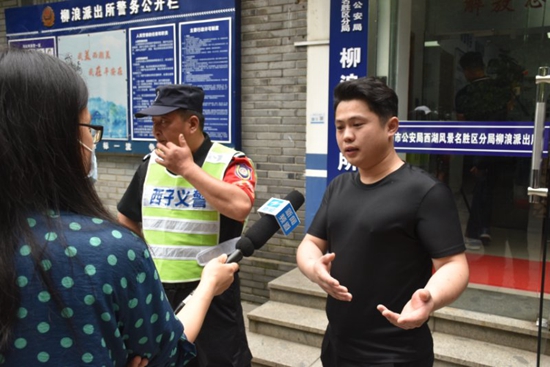 5月20日下午6點許,在西湖景區(qū)公園集賢亭附近,某年輕男子突然落水,一位穿著“西子義警”制服大叔,迅速跳入西湖救人!袄霞襾砹藘擅笥,我當(dāng)時陪他們在西湖乘船,剛在碼頭上岸,就聽見有人喊‘落水了’!眲P回憶說,“順著呼喊聲望去,在距離我們大約100多米處,很多人在湖邊圍觀,我知道出事了,就急忙向事發(fā)現(xiàn)場跑去!