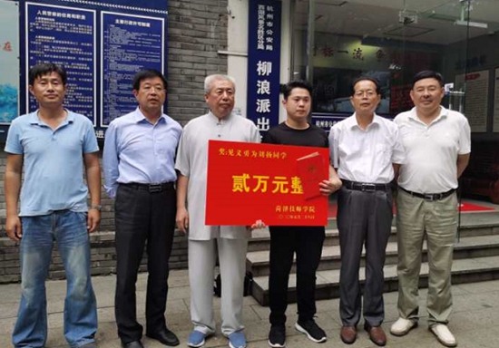 5月27日下午,菏澤技師學(xué)院黨委副書記梁衍海等緊急趕赴杭州,為劉揚壯舉備下2萬元獎勵紅包。接過母校大紅包,羞澀而又激動的劉揚表示,“感謝社會各界的關(guān)心支持,感謝母校領(lǐng)導(dǎo)的抬愛!作為每一名市民,誰遇到這個情況,都會出手相助的!”