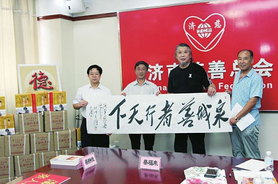 今年9月份劉成方帶頭為東平寸盲人送去了治療眼睛的現(xiàn)金、禮品,并幫助聯(lián)系醫(yī)院呼吁為她捐款。近幾年,作為一名書(shū)畫(huà)家,劉成方因?yàn)榛疾〔荒軐?xiě)字、畫(huà)畫(huà),捐贈(zèng)作品少了,但他那顆愛(ài)心沒(méi)有停止,為社會(huì)公益慈善事業(yè)力所能及做奉獻(xiàn)的行動(dòng)沒(méi)有止步。二十年間,劉成方以畫(huà)院公益慈善捐助為主體,構(gòu)建書(shū)畫(huà)家文化慈善的平臺(tái),弘揚(yáng)、傳播書(shū)畫(huà)慈善價(jià)值,讓慈善文化進(jìn)家庭、進(jìn)學(xué)校、進(jìn)社區(qū)、下鄉(xiāng)村,引導(dǎo)書(shū)畫(huà)家全身投入到公益慈善文化活動(dòng)中去。劉成方先后向天橋匯才學(xué)校,章丘圣井中學(xué),長(zhǎng)清關(guān)王小學(xué)、雙泉中學(xué)、馬山中學(xué)、歷城區(qū)港溝中學(xué)等29所中小學(xué)捐獻(xiàn)了價(jià)值二百余萬(wàn)元的書(shū)畫(huà)作品及十幾萬(wàn)文體用品,捐出的現(xiàn)金近十萬(wàn)元。他用真誠(chéng)的心贏得了大家的信任,目前,有上百名慈善義工跟著他做慈善公益活動(dòng)。
